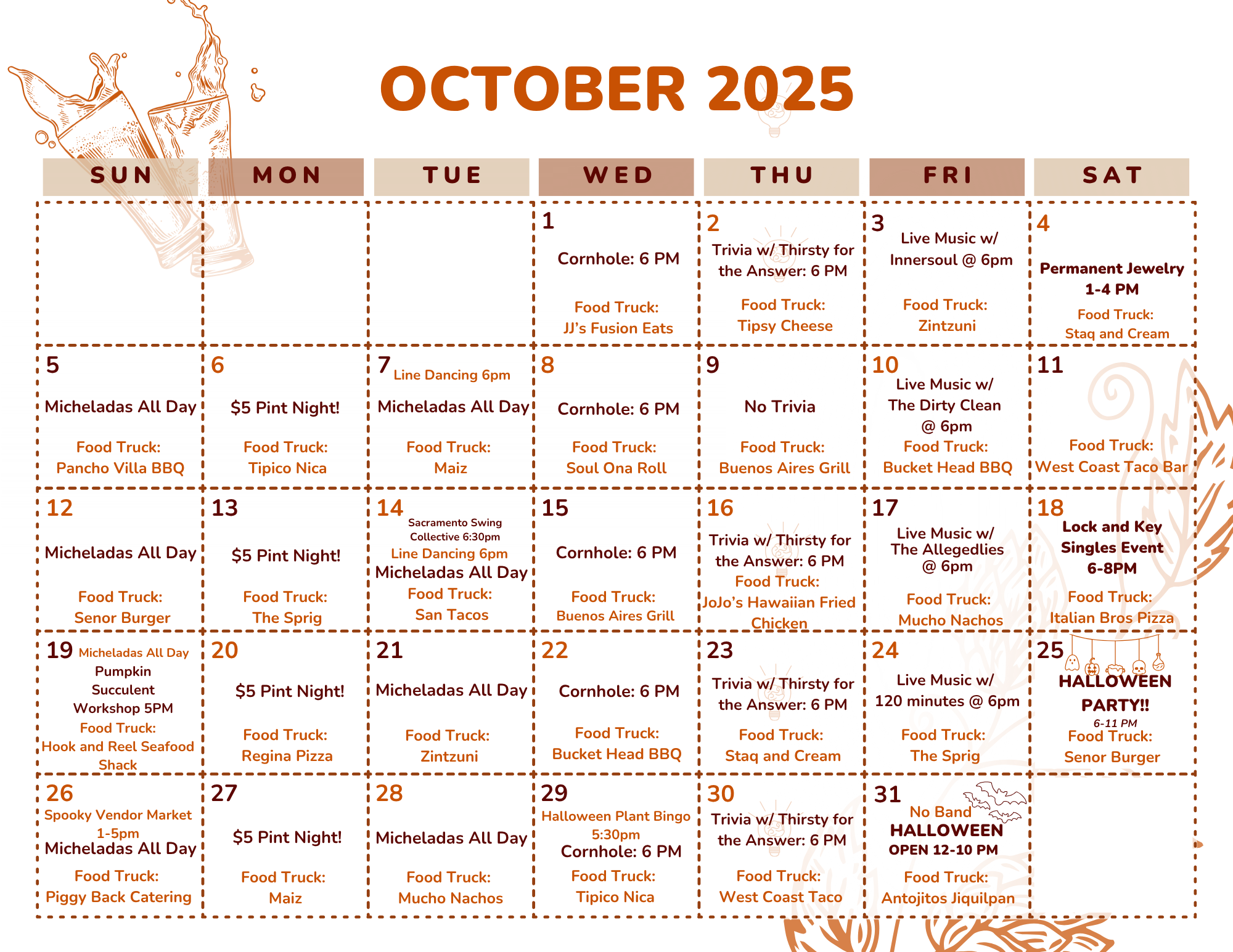 We try and keep our calendars as up-to-date as possible, but there is always the possibility of last minute changes. For the most accurate information please call the taproom 916-389-0046
